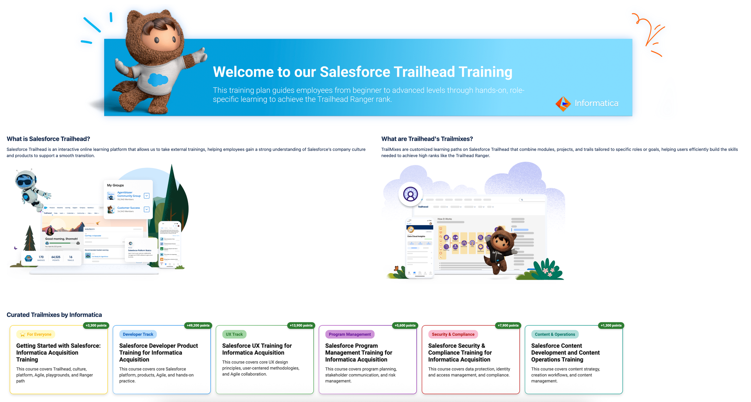 I led the end-to-end design and launch of Informatica’s Salesforce Trailhead Training Roadmap, a scalable learning hub that unified onboarding for 5,000+ employees. I also conceptualized the Trailblazer Challenge, a gamified initiative that incentivized 830+ participants, accelerated acquisition integration, and fostered a high-energy culture of growth.